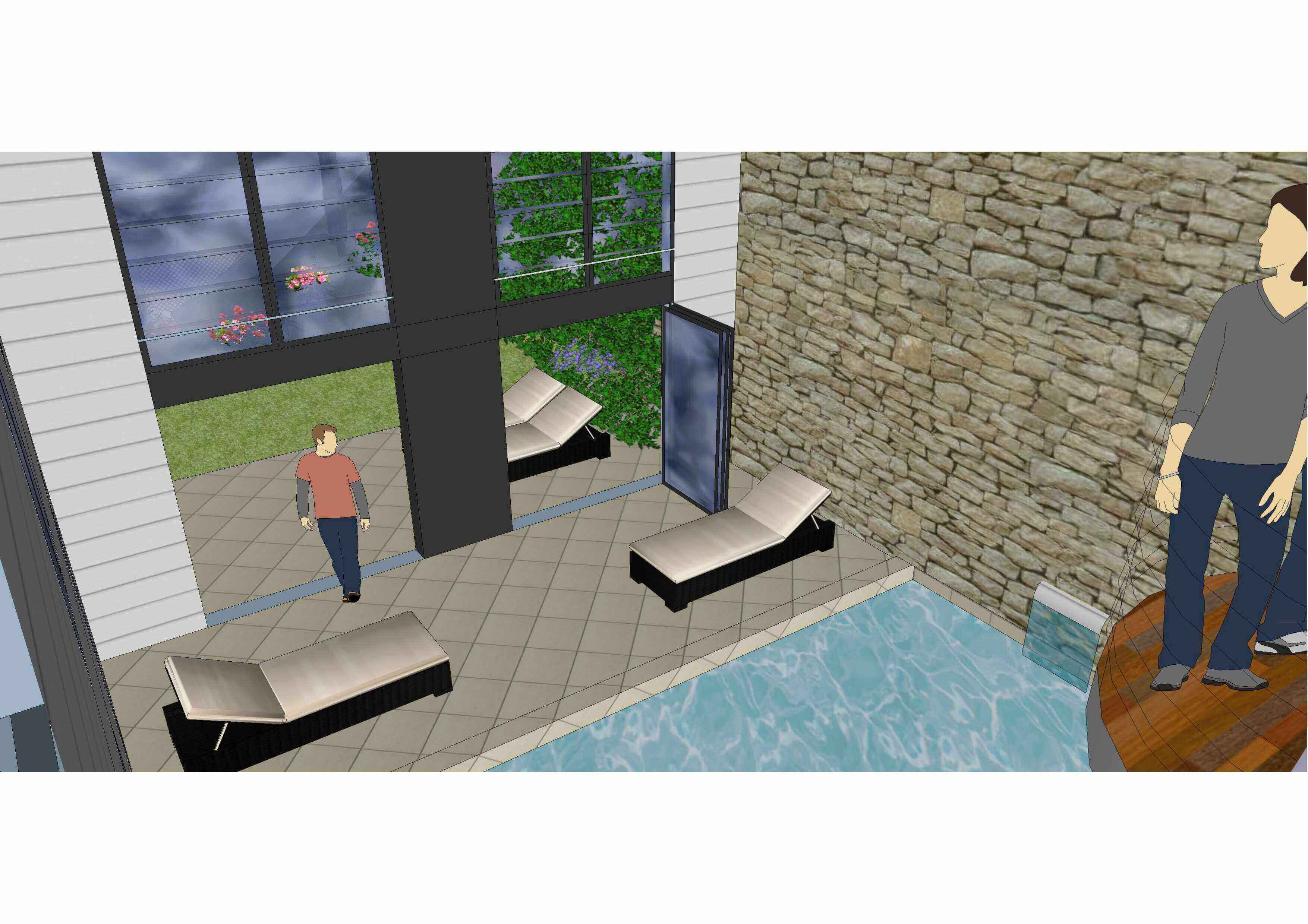 Notre client souhaitait construire une maison sur un terrain a côté du sien pour accueillir ses amis autour de la Piscine Couverte, espace de loisir où l'on trouve aussi une cuisine et 3 chambres séparées avec salles de bain.