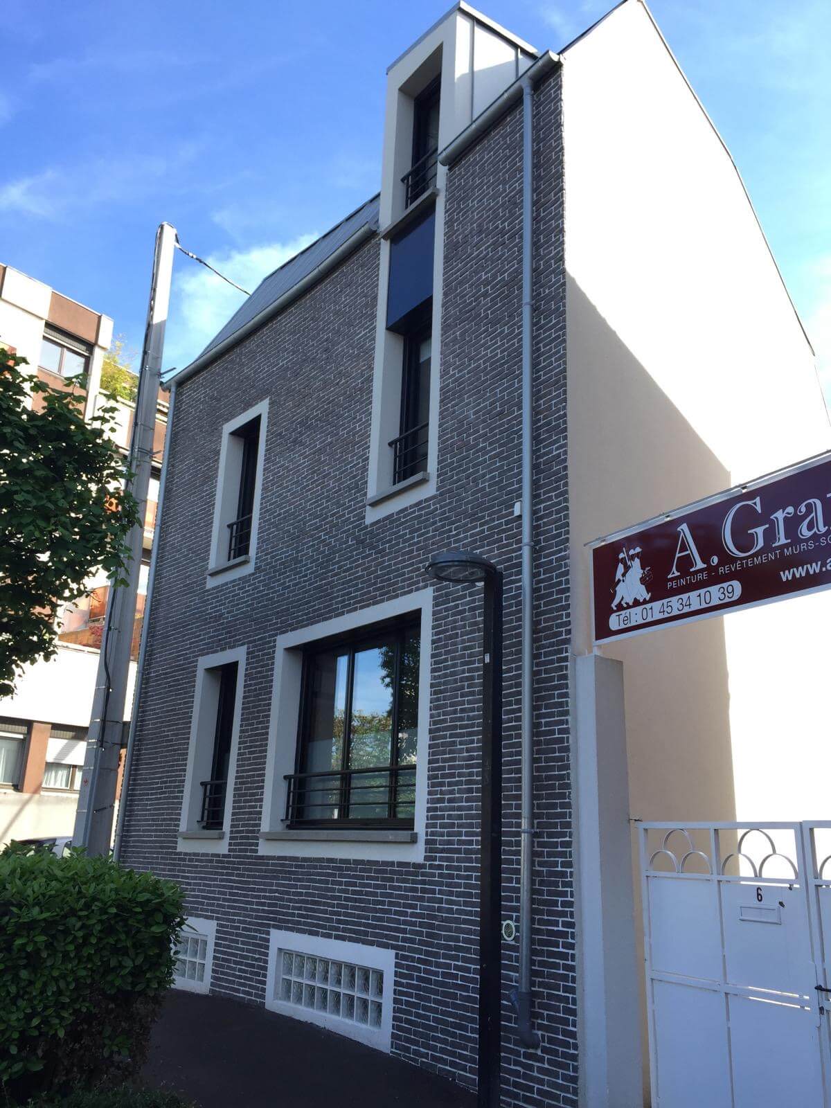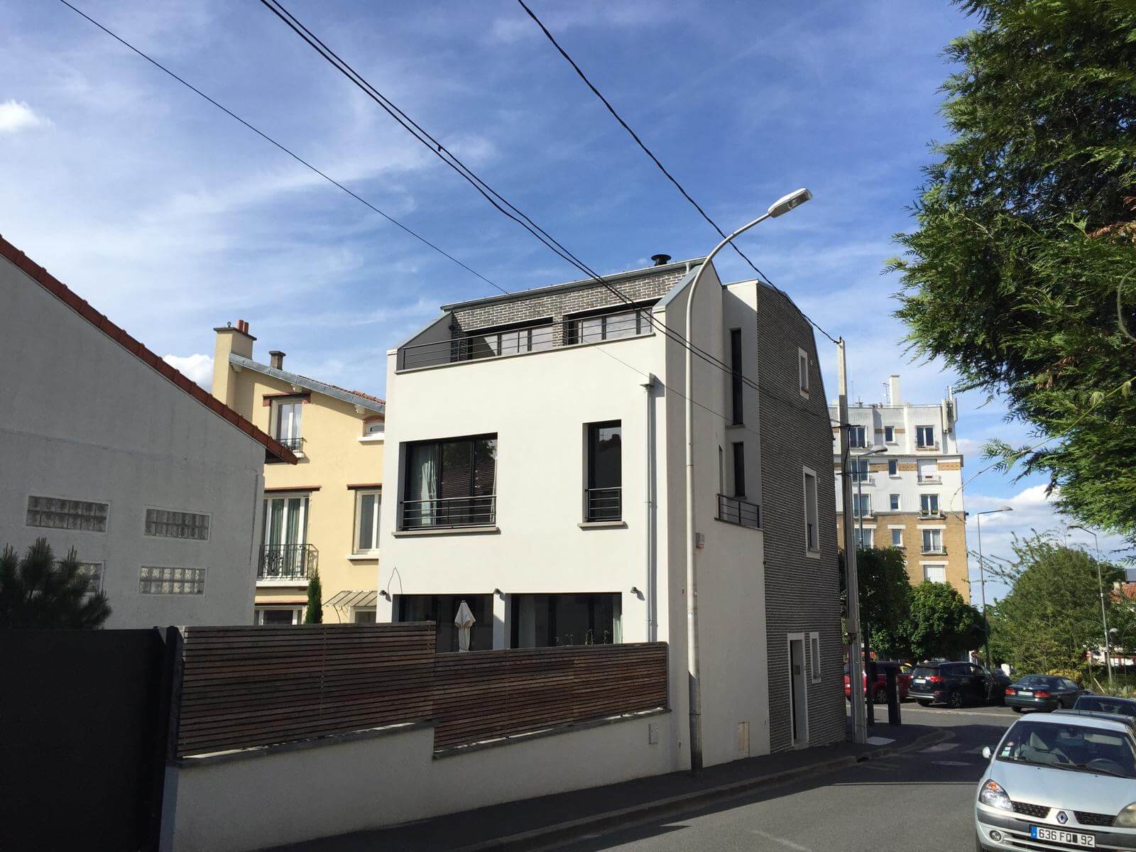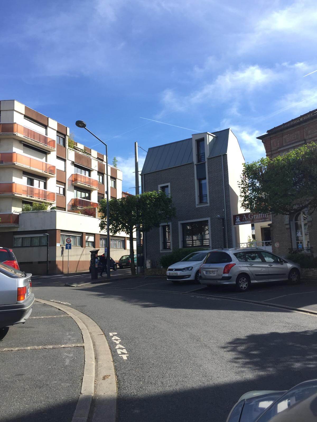 Le défi de ce projet était d'adapter la façade avant à l'arrondi de la place bordée d'immeubles, tout en faisant la liaison sur sa façade arrière avec le tissu pavillonnaire. D'où la mixité architecturale et de matériaux entre les façades avant et arrière.