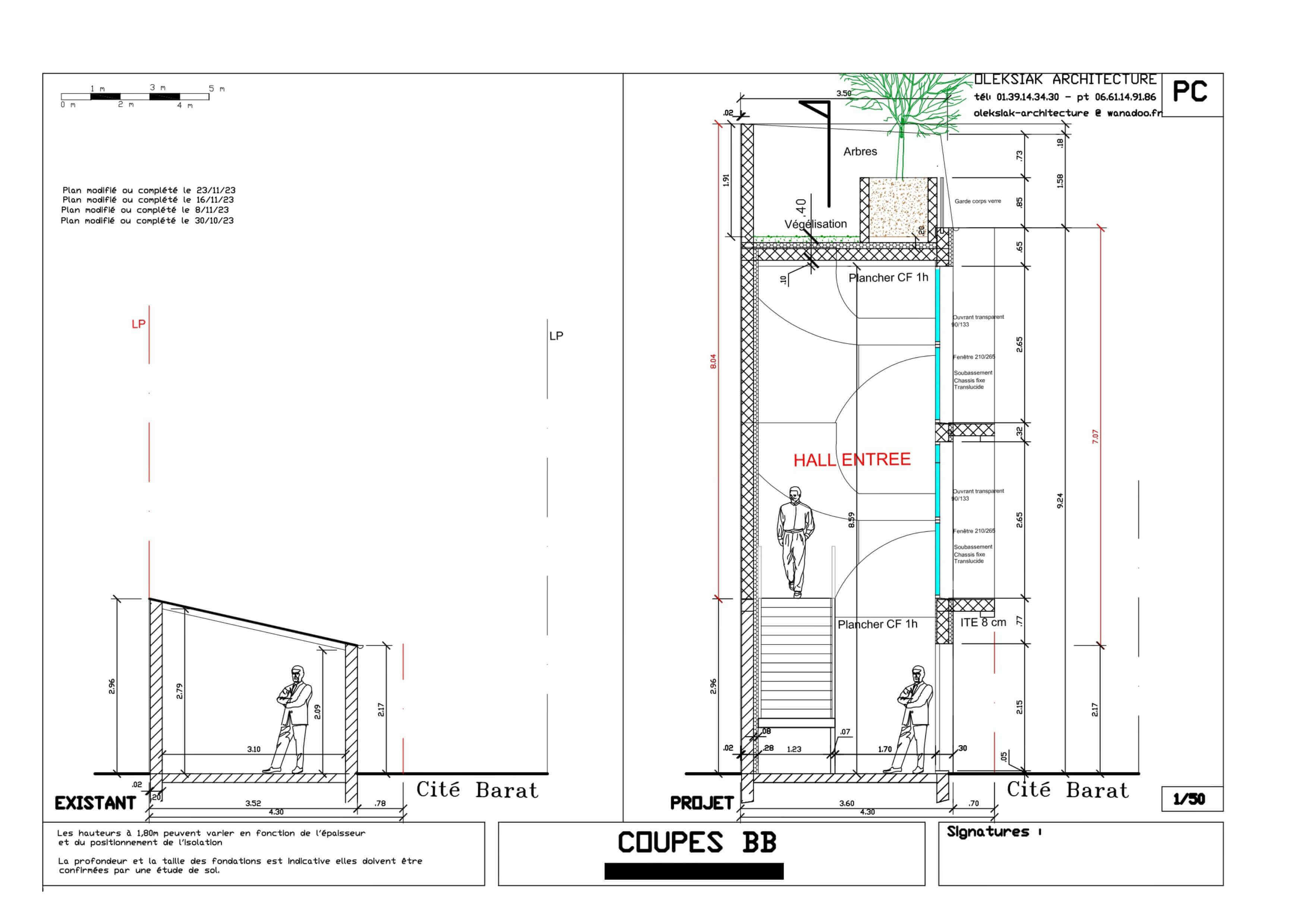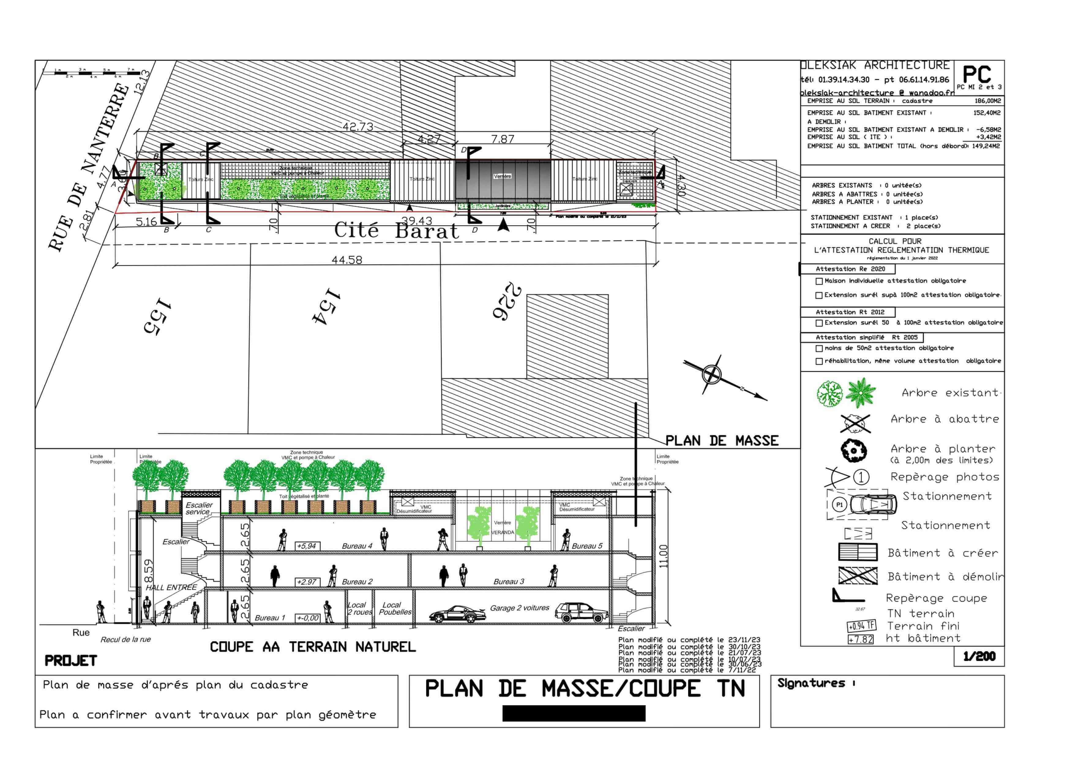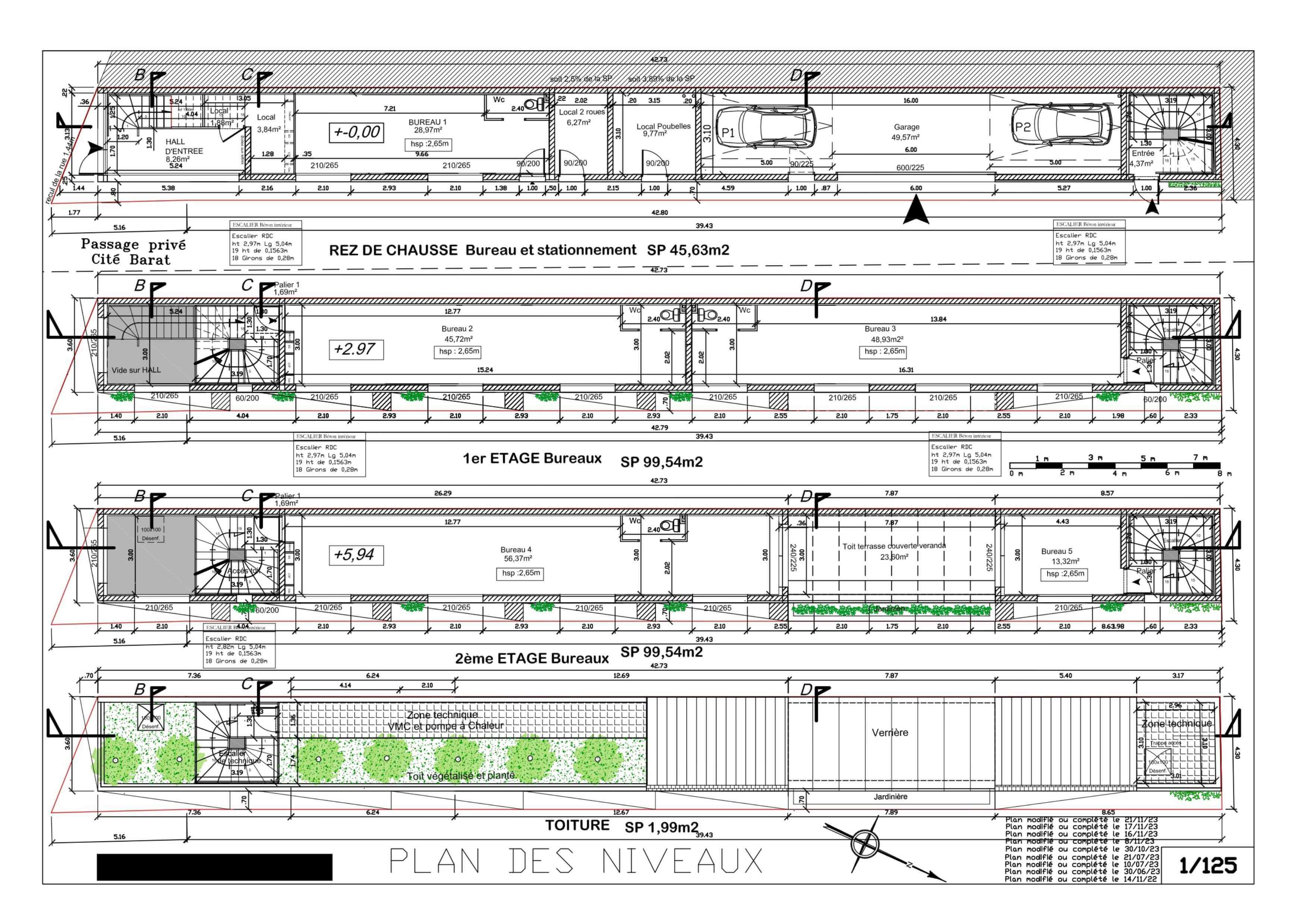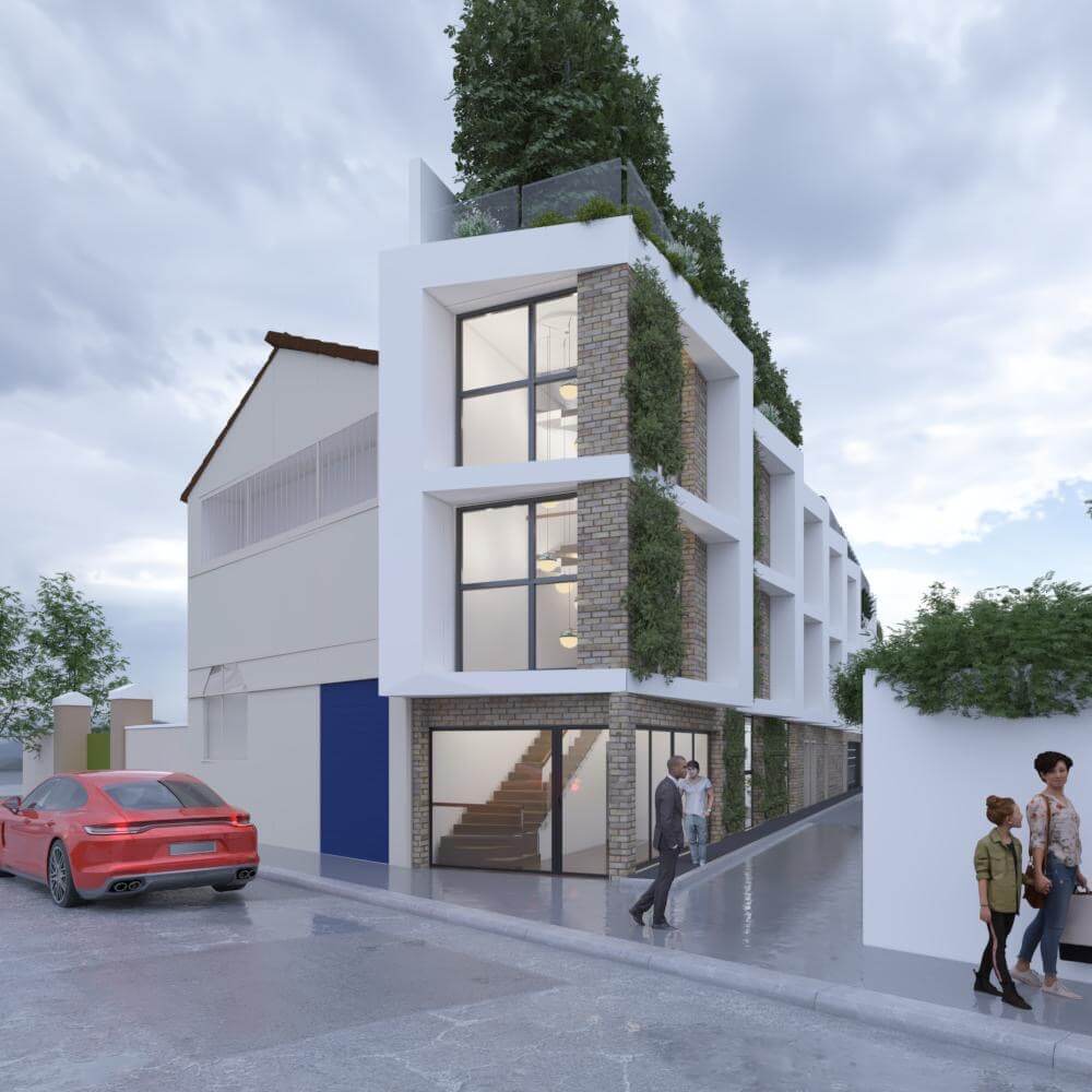 Le projet consiste à créer une surélévation sur un existant hyper étroit constitué de 5 bureaux, d’un espace de détente sous une verrière, un toit végétalisé avec des arbres.